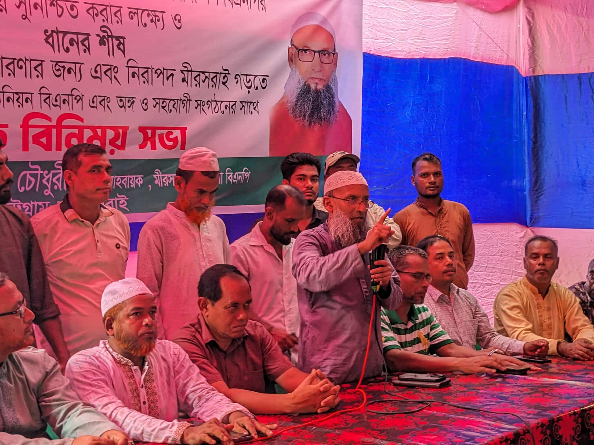 মতবিনিময় সভায় প্রধান অতিথির বক্তব্যে উপজেলা বিএনপির সাবেক আহবায়ক শাহীদুল ইসলাম চৌধুরী বলেন, ‘আসন্ন জাতীয় সংসদ নির্বাচনে বাংলাদেশ জাতীয়তাবাদী দল বিএনপির বিজয় সুনিশ্চিত করার লক্ষে ও ধানের শীষ প্রতীকের প্রচার প্রচারণার জন্য এবং নিরাপদ মিরসরাই গড়তে নেতাকর্মীদের মাঝে বিএনপির ভারপ্রাপ্ত চেয়ারম্যান তারেক রহমানের ৩১ দফা কর্মসূচীর লিফলেট বিতরণের উদ্যোগ নিয়েছি।
